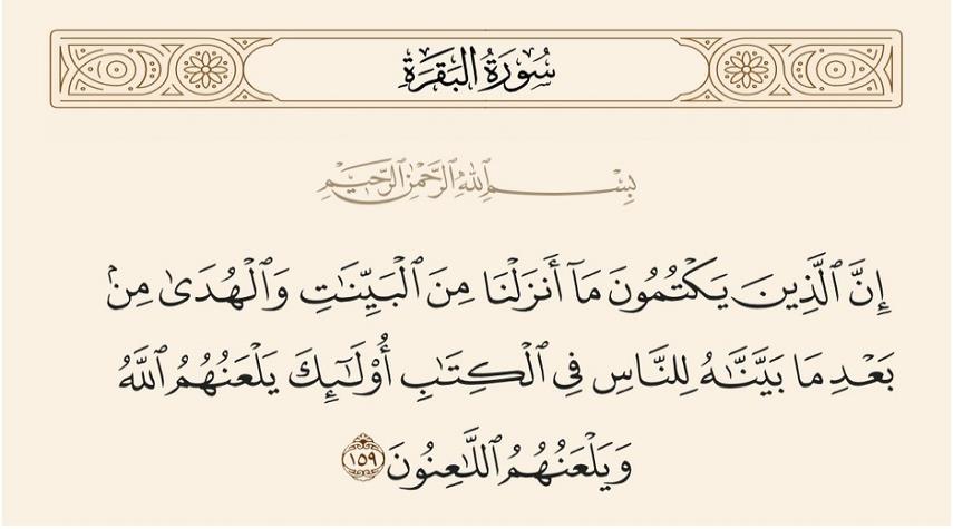 القرآن الكريم-الكوثر: قال الله في كتابه المجيد: "إِنَّ الَّذِينَ يَكْتُمُونَ ما أَنْزَلْنا مِنَ الْبَيِّناتِ وَ الْهُدى مِنْ بَعْدِ ما بَيَّنَّاهُ لِلنَّاسِ فِي الْكِتابِ أُولئِكَ يَلْعَنُهُمُ اللَّهُ وَ يَلْعَنُهُمُ اللاَّعِنُونَ". الآية الـ159 من سورة البقرة المباركة.