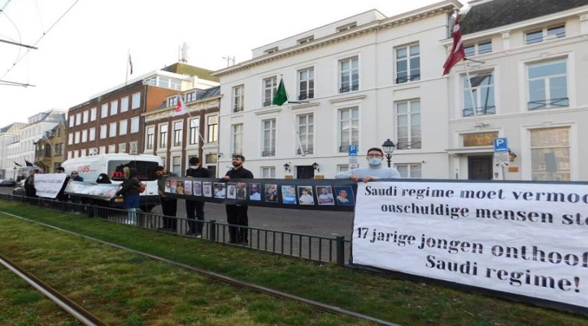 اوروبا - الكوثر: نظم جمع من نشطاء حقوق الانسان وقفة احتجاجية أمام سفارة الرياض في لاهاي دعما للابرياء المعتقلين في سجون السعودية واحتجاجا على تنفيذ احكام الاعدام بحق 81 شخصا منهم.