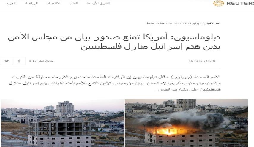 موقع رويترز تحدث عن اجهاض واشنطن للتحركات الكويت و اندونيسيا وجنوب افريقيا لادانة الكيان الصهيوني لهدمه منازل الفلسطينيين في القدس المحتلة.