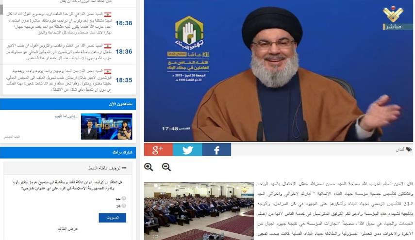 نقل موقع قناة المنار ما قاله الامين العالم لحزب الله سماحة السيد حسن نصرالله خلال الاحتفال بالعيد الواحد والثلاثين لتأسيس جمعية مؤسسة جهاد البناء الانمائية “هناك في لبنان من يصوّر ان حزب الله هو من يحكم ويسيطر على الحكومة ومجلس النواب وغيرها من الادارات، والحقيقة ان حزب الله ليس حاكما للبنان".