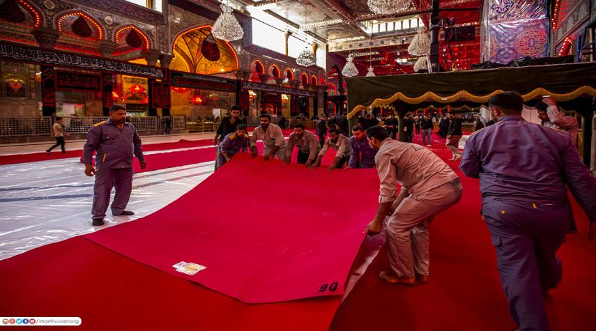 العراق - الكوثر: نشر موقع العتبة الحسينية المقدسة صوراً للترتيبات التي يقوم بها خدمة مقام الإمام الحسين عليه السلام في أصحن الحرم استعداداً لاستقبال ملايين الزائرين من العراق وخارجه في عاشوراء الإمام الحسين عليه السلام.