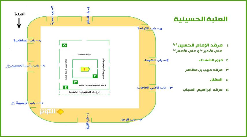 خريطة مبسطة لمداخل العتبة الحسينية ومراقد إبراهيم المجاب ومسلم بن عقيل وقبور الشهداء والإمام الحسين و... .
