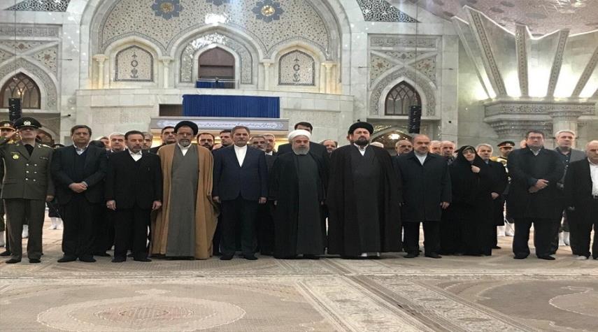 ايران - الكوثر: زار رئيس الجمهورية حسن روحاني و أعضاء الحكومة صباح اليوم الاحد المرقد الطاهر للامام الخميني (ره) لتجديد العهد والميثاق مع مبادئ مؤسس الجمهورية الاسلامية الايرانية وذلك بالتقارن مع أيام عشرة الفجر ذكرى انتصار الثورة الاسلامية.