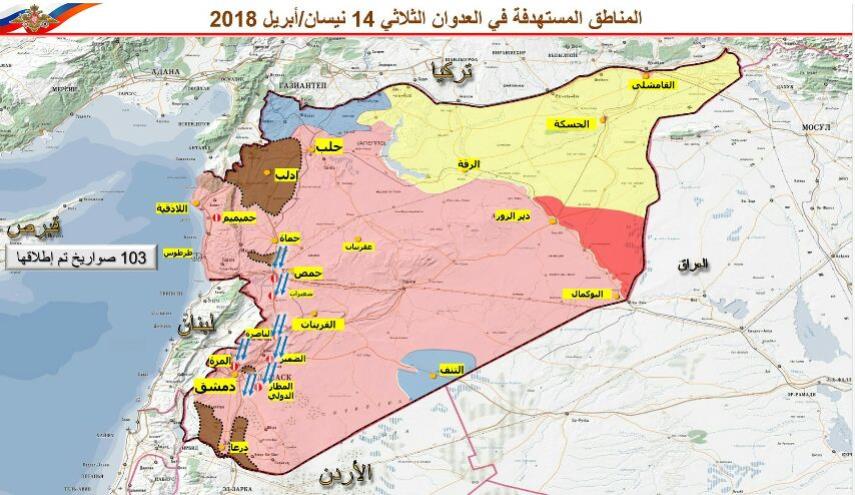 سوریا _ الكوثر: نشرت وزارة الدفاع الروسية خريطة وقائمة بأسماء المواقع التي استهدفتها قوات العدوان الثلاثي على سوريا.