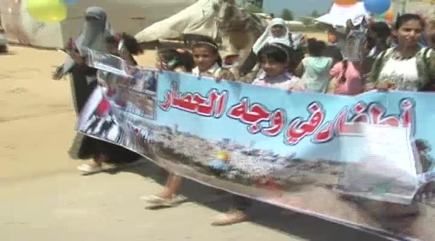 الجرائم الصهيونية...أطفال غزة يتظاهرون رفضاً للحصار والواقع الإنساني الذي فرضه الإحتلال