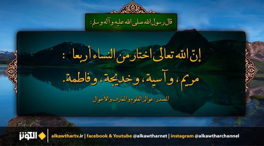 اهل البيت - الكوثر: تحتل السيدة فاطمة الزهراء عليها السلام المكانة السامية في السفر الرسالي، وقد أشاد القرآن الكريم بالتصريح وبالتلميح بها، كمثل ما أشاد بها الحديث النبوي الشريف، وقد وورد الذكر للسيدة فاطمة الزهراء عليها السلام" في القرآن الكريم وفي قسط من الماثرات والمواقف، وقد ذكر أبو الهذيل عن مقاتل عن محمد بن الحنفية عن ابيه: ان رسول الله "صلى الله عليه واله" قرأ:﴿ إِنَّ اللَّهَ اصْطَفَاكِ وَطَهَّرَك﴾[1] فقال : "يا علي خير نساء العالمين اربع: مريم بنت عمران ، وخديجة بنت خويلد، وفاطمة بنت محمد، وآسية بنت مزاحم"[2].