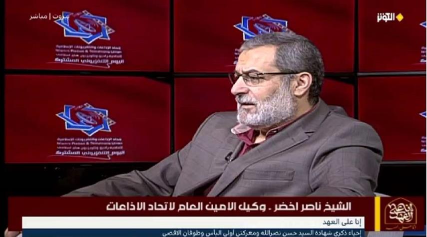 قال الشيخ ناصر أخضر، وكيل الأمين العام لاتحاد الإذاعات والتلفزيونات الإسلامية، إن الإعلام المقاوم يجب أن يلعب دوراً محورياً في الحفاظ على نهج الشهيد السيد حسن نصر الله ونشر فكره ومواقفه . وأكد أن هذا الدور يتطلب الاستمرار في التمسك بهذا النهج والفكر والثقافة، ونقلها بشكل دائم في أعمال الإعلام والمؤسسات المختلفة.
