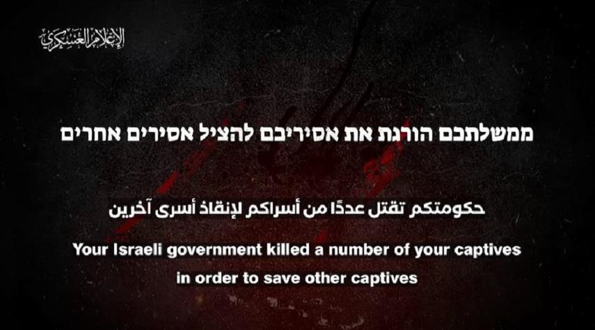 نشرت كتائب القسّام فيديو توجّهت فيه إلى المستوطنين الإسرائيليين، معلنةً أنّ حكومة الاحتلال و"جيشه" قتلا 3 من أسراهم، أحدهم يحمل الجنسية الأميركية، مقابل إنقاذه أولئك الأربعة.