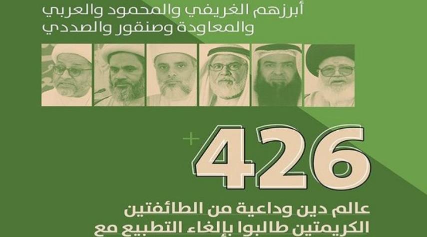 طالب 426 عالما وداعية سنيًا وشيعيًا من البحرين، السلطات البحرينية وبقية الدول العربيَّة والإسلاميَّة المطبعة مع الكيان الصُّهيوني بـ"قطع علاقات التّطبيع الدّبلوماسيّة والاقتصاديّة، وإلغاء جميع اتِّفاقيَّات التَّطبيع التِّجاريَّة والأمنيَّة وإغلاق السَّفارات".