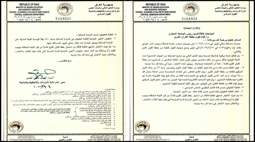 إنّ للمتقين مفازا-الأخبار: قبول الطلبة يكون ضمن قناة تسمى قناة الطلبة من حفظة القرآن الكريم، وتكون 2 % من خطة القبول المركزي، ويتمّ التقديم للتنافس على المخصص للخطة بمعدل أقل من (3) درجات من الحد الأدنى للقبول المركزي، ويتمّ فتح هذه القناة بعد إعلان نتائج القبول المركزي أسوة بالطلبة المتميزين...