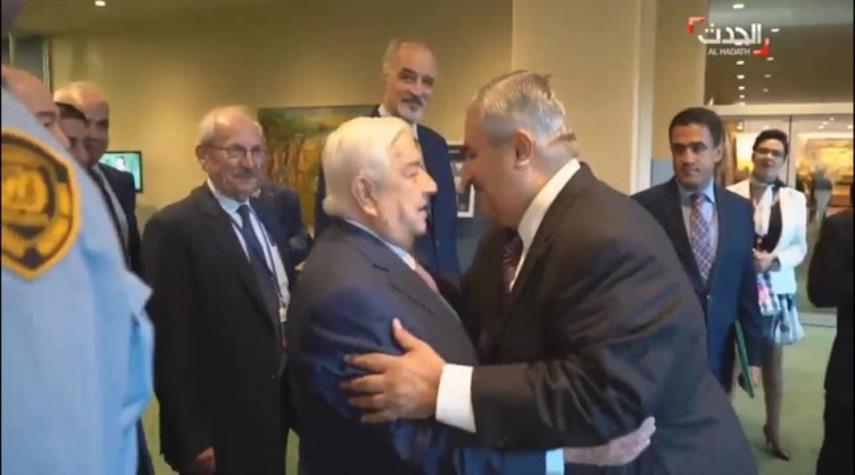 البحرين - الكوثر: بثت قناة "العربية" السعودية، اليوم الأحد، مقطعاً مصوراً لوزير الخارجية البحريني خالد بن أحمد آل خليفة وهو يتقدم بابتسامة عريضة تجاه وزير الخارجية السوري وليد المعلم لمصافحته بحرارة وتقبيله، وذلك على هامش أعمال الجمعية العامة للأمم المتحدة في نيويورك.