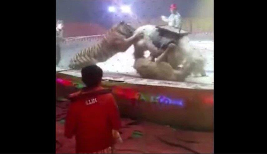 منوعات_الكوثر: هاجم أسد ونمر بعنف حصانا في سيرك بالصين .