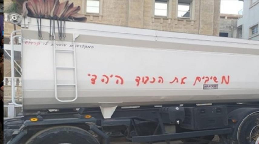 فلسطين المحتلة-الكوثر: خط مستوطنون فجر اليوم الأحد، شعارات عنصرية معادية للعرب وأعطبوا اطارات عدد من المركبات والشاحنات في مدينة كفر قاسم غرب الضفة الغربية.