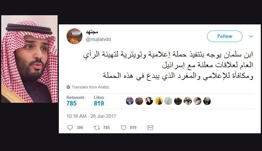 كشف المغرد السعودي الشهير “مجتهد” عن أن ولي العهد السعودي محمد بن سلمان قد “وجه” بتنفيذ حملة إعلامية واسعة لتهيئة الرأي العام السعودي لـ”علاقات” معلنة مع الكيان الاسرائيلي.
