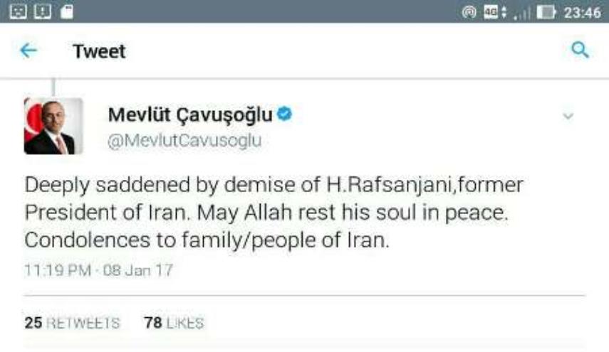 عزى وزير الخارجية التركي مولود جاووش اوغلو في بيان له على موقع التواصل الاجتماعي 'تويتر' بوفاة رئيس مجمع تشخيص مصلحة النظام آية الله اكبر هاشمي رفسنجاني.