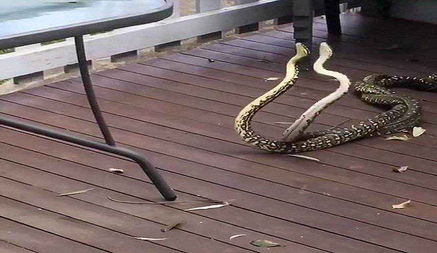 منوعات - الكوثر: نشرت لقطاتٌ مثيرة لمعركةٍ دارت بين ثعبانيْن ذكرين ضخميْن على شُرفة أحد المنازل في ولاية “نيوساوث ويلز” الأستراليّة؛ للظفر بالزواج من أنثى .