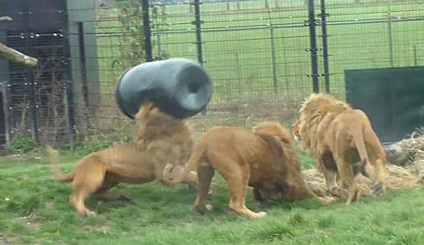منوعات_الكوثر: حاول أسد بإحدى حدائق الحيوان في هولندا، إنزال رأسه في “برميل” سعيا منه للحصول على أخر ما تبقى من الطعام، لكن رأسه حُشرت في البرميل ولم يستطع إخراجها وركض الأسد يمينًا ويسارًا، محاولا منه إبعاد البرميل عن رأسه، لكنه لم يستطع فتدخل أصدقائه فورًا، لمساعدته في إزاحة البرميل، وعلى ما يبدو فإنهما لم يفلحا في ذلك.
