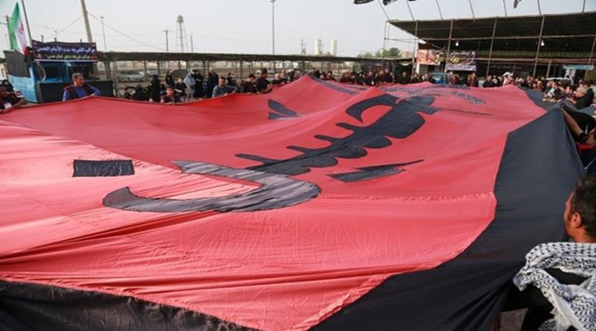ايران-الكوثر: تم رفع أكبر راية عزاء للإمام الحسين (ع) بمنفذ شلمجة الحدودي مع العراق والذي يعبر منه زائرو الاربعينية، وتبلغ مساحته 214 مترا مربعا وقد كتبت عليه عبارة «یالثارات الحسین».