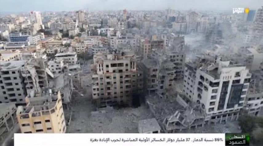 قال المكتب الاعلامي الحكومي في تقرير نشره لأهم احصائيات حرب الابادة الجماعية التي يشنها الاحتلال الصهيوني على قطاع غزة إن اكثر من 80% هي نسبة الدمار في القطاع ، مبيناً أن نسبة الدمار في قطاع غزة وصلت الى 86 % ، فيما بلغت الخسائر الاولية المباشرة لحرب الابادة الجماعية 37 مليار دولار .