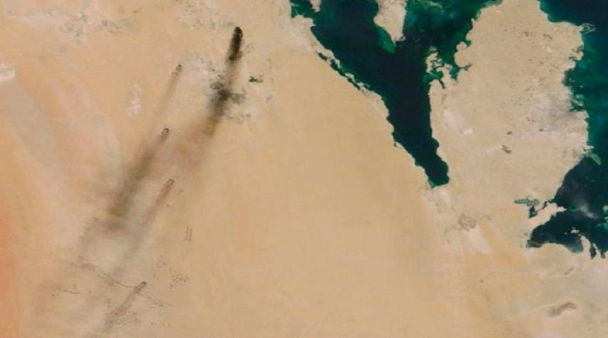 السعودية - الكوثر: نشر موقع Business Insider، امس الأحد، صورا لاقمار صناعية من ناسا وورلدفيو تظهر الدخان الناتج عن الحرائق الناجمة عن قصف حركة انصار الله اليمنية لمنشآت ارامكو النفطية، والذي يمكن مشاهته من الفضاء.
