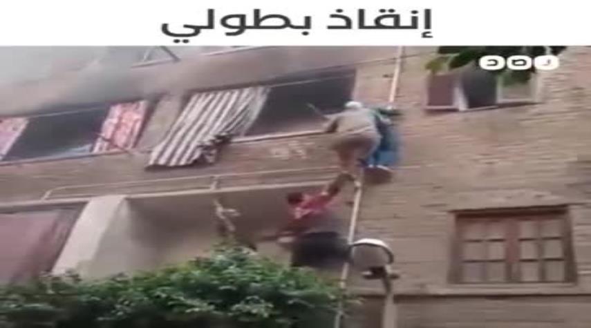 شاهد.. شاب مصري بقدرات خارقة ينقذ ثلاثة اشخاص من حريق هائل