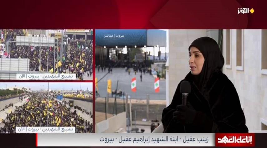 تحدثت إبنة الشهيد إبراهيم عقيل، زينب عقيل عن مشهد الزحف الشعبي الواسع في مراسم تشييع الشهيد السيد حسن نصر الله ووصفته بالمهيب، رغم البرد القارس وتحليق مكثف للطائرات الحربية الصهيونية.