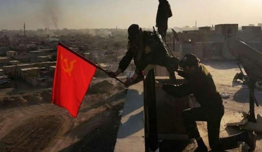سوريا _ الكوثر: رفع مقاتلون من “كتيبة الحرية الأممية” العلم السوفيتي الأحمر فوق الرقة بعد تحريرها من قبضة داعش، في محاكاة لرفع راية النصر السوفيتية فوق برلين، في آخر أيام الحرب العالمية الثانية.