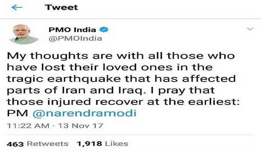 الهند - الكوثر: أعرب رئيس وزراء الهند "ناريندا مودي" عن تعازيه للأسر المتضررة من الزلزال الذي وقع في إيران والعراق.