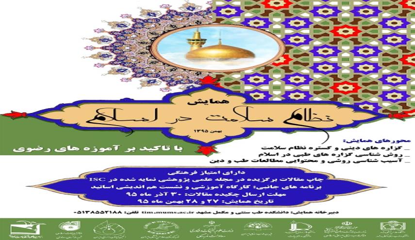 ستنظّم کلیة الطب التقليدي بمدينة "مشهد" الايرانية، مؤتمراً وطنياً تحت عنوان "النظام الصحي في الإسلام وفق تعالیم الإمام الرضا(عليه السلام)".