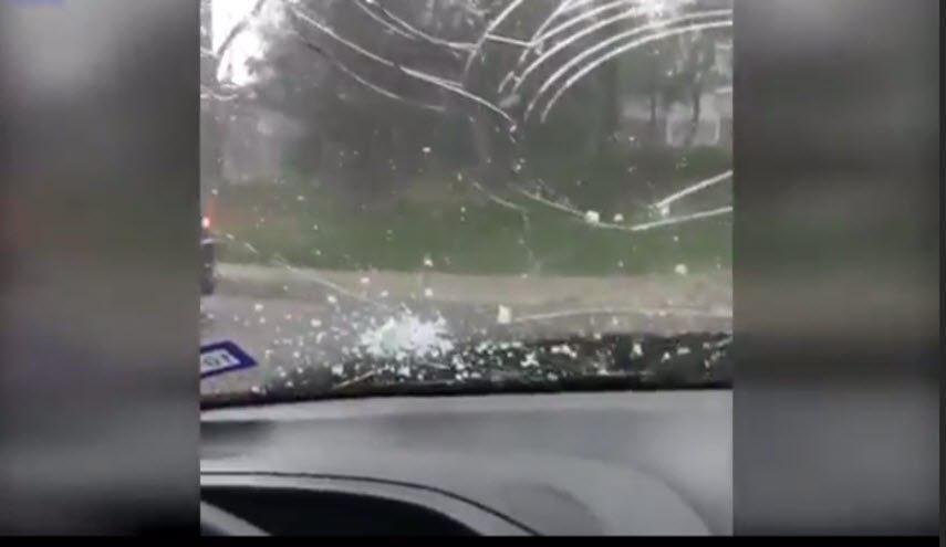 بالفيديو .. عاصفة "برد" تحتجز عائلة داخل سيارة وتحطم أجزاء منها