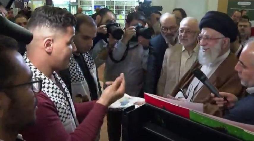 شاهد ..شاب فلسطيني يهدي ويأخذ هدية من الامام الخامنئي