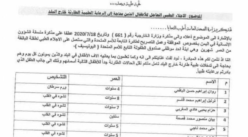 اليمن-الكوثر: اختارت منظمة اليونيسيف التابعة للأمم المتحدة، طفلة إحدى موظفات صندوق الطفولة التابع للأمم المتحدة لإجلائها من اليمن وإرسال طائرة خاصة، وذلك في ظل وجود آلاف الأطفال اليمنيين الذين يعانون أمراضاً مستعصية تستدعي سفرهم إلى الخارج.