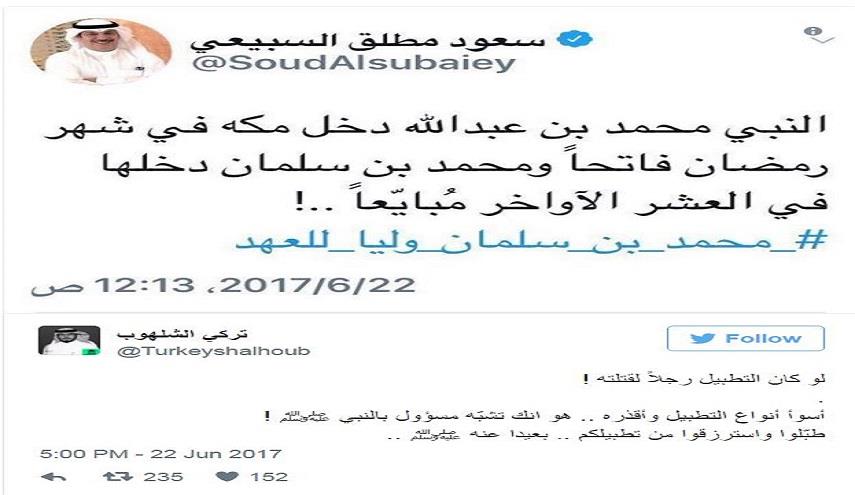 أثار المحامي الكويتي "مطلق السبيعي"، جدلاً واسعاً على موقع التواصل الاجتماعي "تويتر"، في تغريدة أطلقها شبه فيها ولي العهد السعودي محمد بن سلمان بـ"النبي محمد" صلى الله عليه وآله.