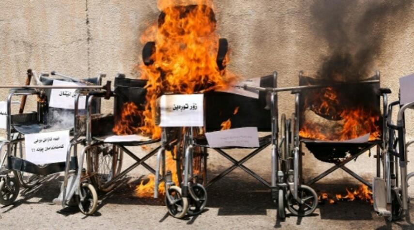 العراق _ الكوثر: قام عدد من ذوي الاحتياجات الخاصة باحراق بعض كراسيهم الخاصة اليوم الأربعاء، أمام مكتب السليمانية لبرلمان كردستان.