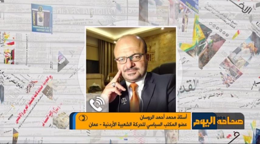 صحافة الیوم-خاص الکوثر: تحدث لقناة الكوثر الفضائية من عمان عضو المكتب السياسي للحركة الشعبية الاردنية "محمد احمد الروسان" في برنامج صحافة اليوم حول محور (الشعب الايراني لن يسلم ايران للمافيا).