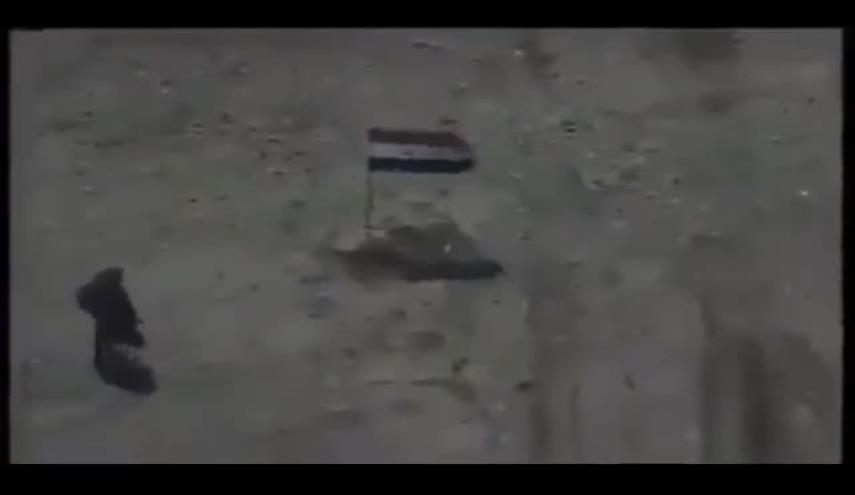 نشر فيديو يظهر داعشي يحاول ان يخلع العلم العراقي ويرميه ارضا، فما كان من طيران الجيش الا ان قدم له هدية قال انها من الشعب العراقي.