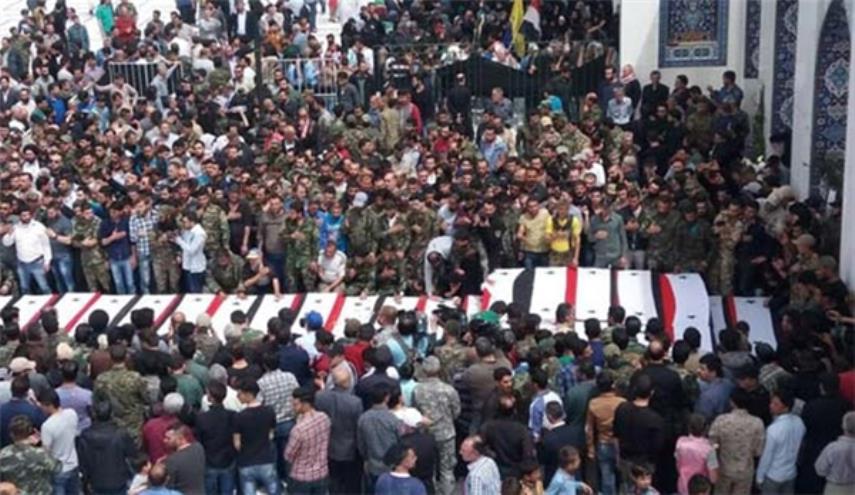 تجمع المئات من المدنيين والمقاتلين في مقام السيدة زينب (س) جنوب دمشق الأربعاء لتشييع أكثر من خمسين شهيدا قضوا خلال تفجير ارهابي استهدفهم قبل نحو أسبوعين بعد اجلائهم من بلدتي كفريا والفوعة في شمال غرب سوريا.