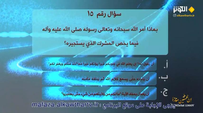 المسابقة القرآنية الرابعة عشر من سلسلة الاسئلة القرآنية الخاصة بالمشاهدين ضمن المسابقة القرآنية ان للمتقين مفازا لعام 2023 ممن عمره 12 سنة فما فوق.