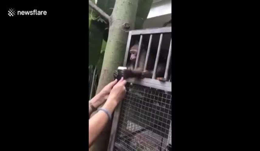 بالفيديو.. صراع بين قرد وسيدة على هاتف محمول