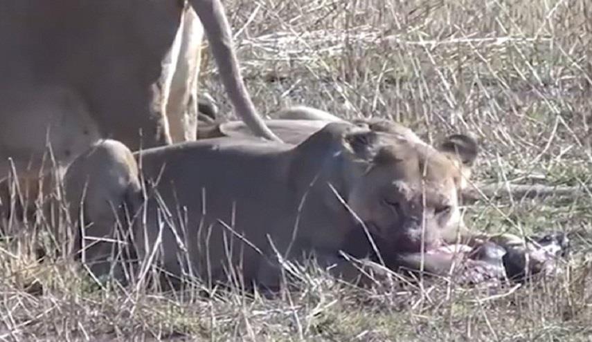 منوعات_الكوثر: هاجم قطيع من الأسود أنثى حيوانا بريا حامل واستطاعت لبؤة من الامساك بها والتهمت جنينها.