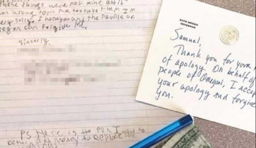بعث الطفل صامويل، برسالة إلى حكومة ولاية أوريغون بالولايات المتحدة الأمريكية، اعتذر فيها عن سرقة قلم وحبات بندق من مبنى الكابيتول، خلال هذا العام.