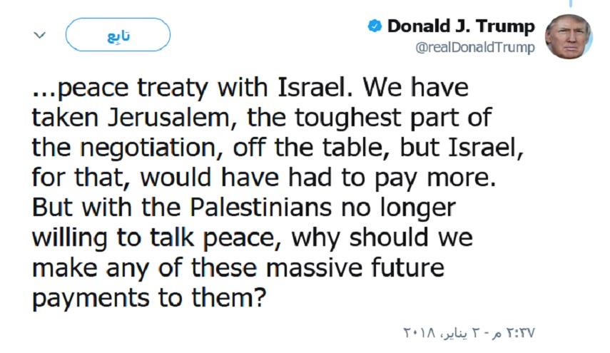 العالم - الكوثر: اعتبر الرئيس الأمريكي، دونالد ترامب، ان القدس اصبحت بعيدة عن طاولة التفاوض مهددا بقطع “المساعدات” عن السلطة الفلسطينية.