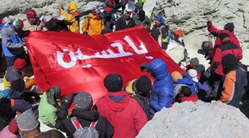 ايران_الكوثر: تزامنا مع ايام شهر محرم الحرام تم رفع راية مرقد الامام الحسين {عليه السلام} في قمة جبل دماوند التي تعتبر اعلى قمة في ايران.