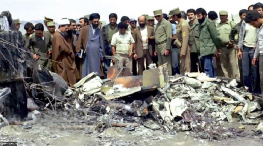 صورة قديمة لقائد الثورة الاسلامية وهو يتفقد حطام الطائرات الاميركية في طبس