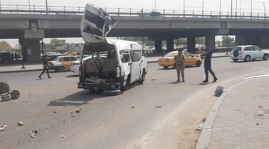 صور.. جرحى في انفجار عبوة ناسفة بسيارة نقل ركب وسط بغداد