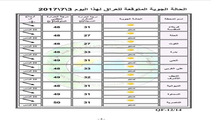 العراق_الكوثر:نشرتهيئة الانواء الجوية والرصد الزلزالي جدول لحالة الطقس ودرجات الحرارة في المحافظات العراقية ليوم السبت...