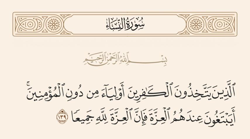 (الَّذِينَ يَتَّخِذُونَ الْكَافِرِينَ أَوْلِيَآءَ مِن دُونِ الْمُؤْمِنِينَ أَيَبْتَغُونَ عِندَهُمُ الْعِزَّةَ فَإِنَّ العِزَّةَ للَّهِ جَمِيعاً ) (سورة النساء- 139)