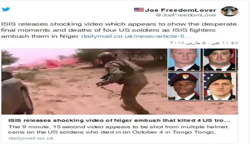 أفريقيا _ الكوثر: نشر تنظيم "داعش" مقطع فيديو، تضمن نصبه كمينًا لجنود من القوات الخاصة الأمريكية في النيجر، والذي أسفر عن مقتل 4 منهم.