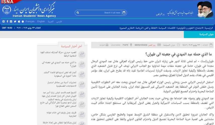 قضية ساخنة_الكوثر: تناول موقع وكالة انباء ايسنا زيارة رئيس الوزاء العراقي عادل عبد المهدي حیث بین بان لم تمض ثلاثة اشهر على زيارته لايران حتى حط رئيس الوزراء العراقي عادل عبد المهدي الرحال مجددا في طهران، حاملا في جعبته ملفات مهمة لتداولها مع الجانب الايراني.