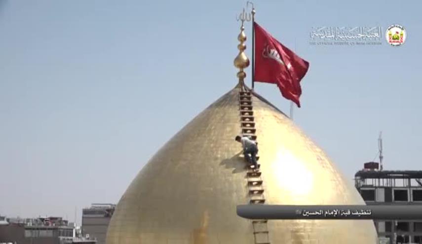شاهد .. كيف يتم تنظيف قبة الإمام الحسين عليه السلام